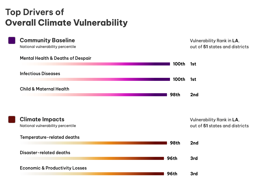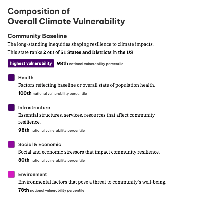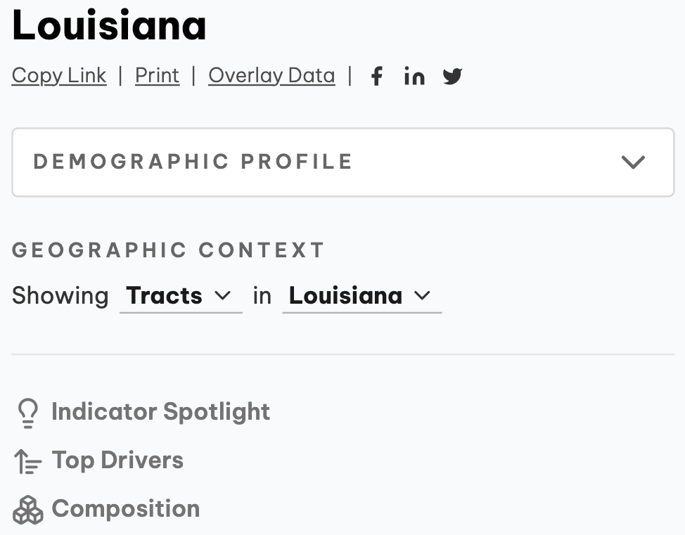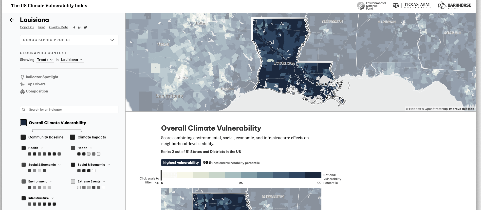Each report features a panel on the left side of the screen where you can learn more about a geography’s demographic profile, alter the geographic context, and understand more about specific drivers of vulnerability. On the right hand side of the screen, maps of the census tract/county are accompanied by vulnerability scores, rankings, and a breakdown of what contributes to the overall vulnerability score.