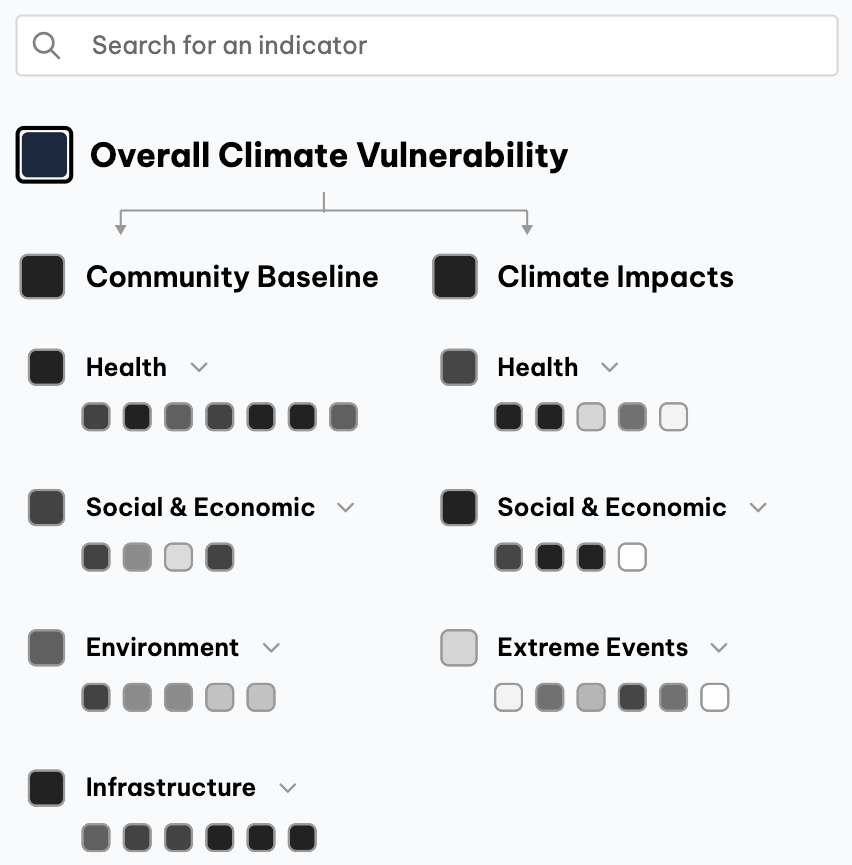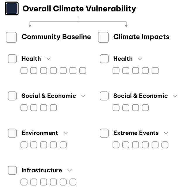 The CVI contains data divided into Community Baseline and Climate Impacts themes, which detail factors and conditions within a community that can limit its resilience to climate challenges and risks. Viewed together, these themes show a community’s cumulative climate vulnerability.