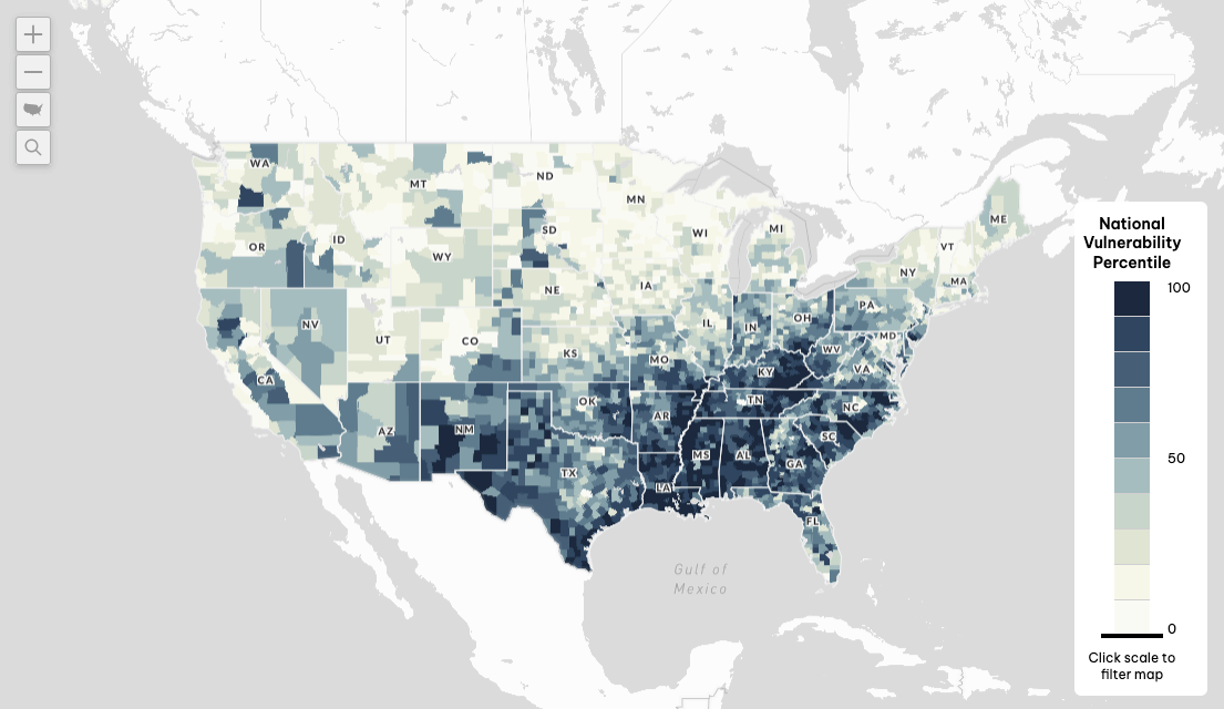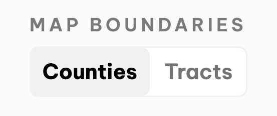 The top right side of the CVI allows you to toggle between viewing counties or census tracts. Census tracts are smaller geographies with fewer people, which are more relevant for frontline advocacy work.