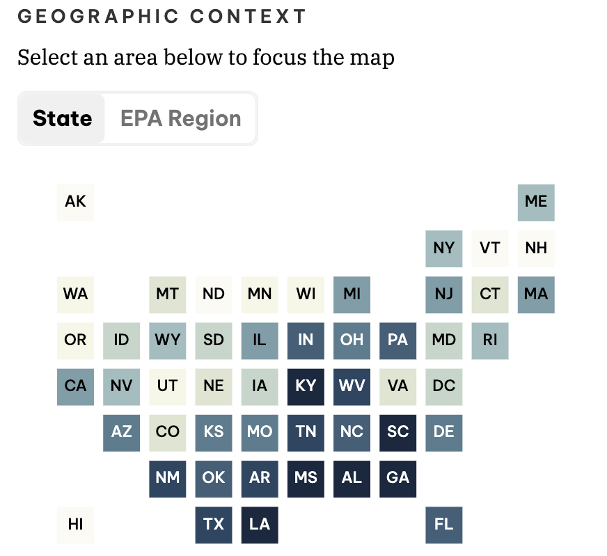 The bottom right side of the CVI allows you to toggle the geographic context of the map, whether you would like to see the data at the state level or the EPA region scale.